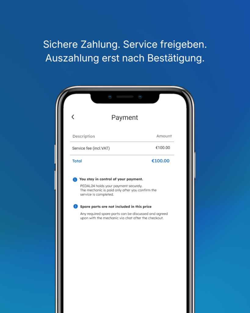 PEDAL24 verwaltet Zahlungen direkt über unsere Plattform. Sobald sowohl Sie als auch der Mechaniker den Service bestätigen, bleibt die Zahlung bis zum Abschluss des Services ausstehend. Nachdem Sie bestätigt haben, dass der Service zufriedenstellend abgeschlossen wurde, wird die Zahlung auf das Konto des Mechanikers freigegeben. Mechaniker können ihre Einnahmen monatlich abheben.
