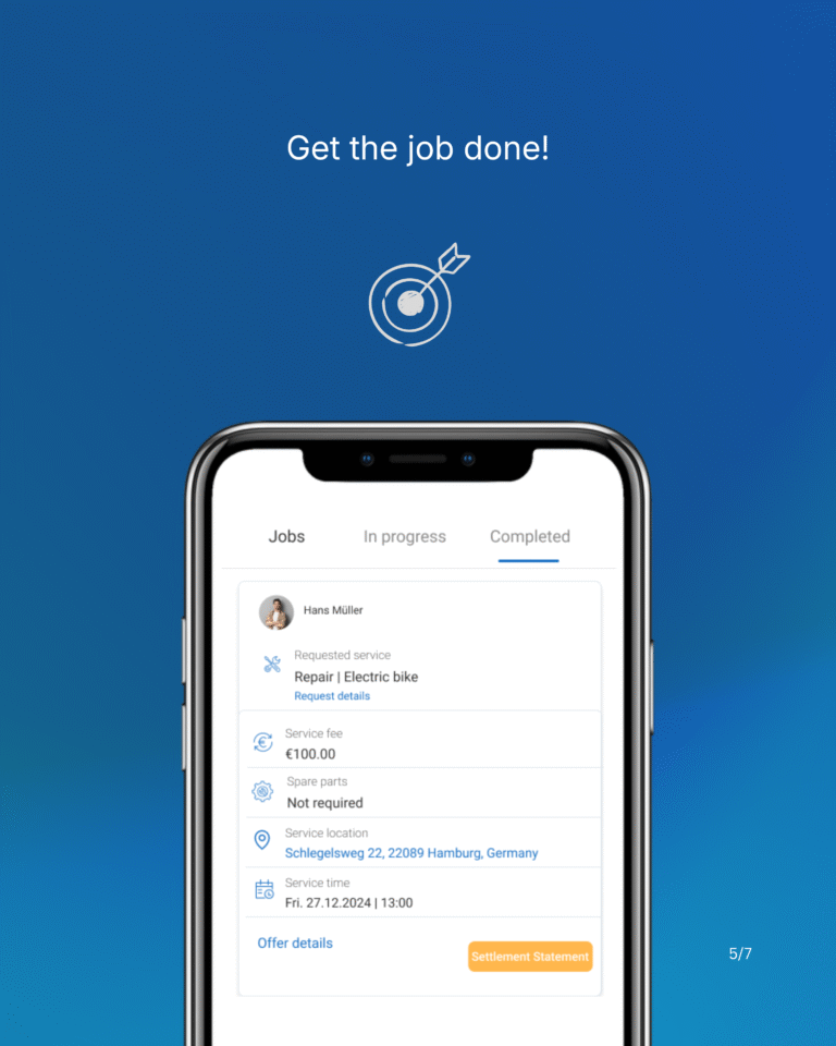 Sobald Ihr Angebot angenommen wird, arbeiten Sie mit dem Kunden zusammen, um den Service an seinem bevorzugten Ort oder in Ihrer eigenen Werkstatt zu arrangieren. Führen Sie den Auftrag mit der Professionalität aus, die Sie auszeichnet, und sorgen Sie für ein reibungsloses und effizientes Erlebnis.