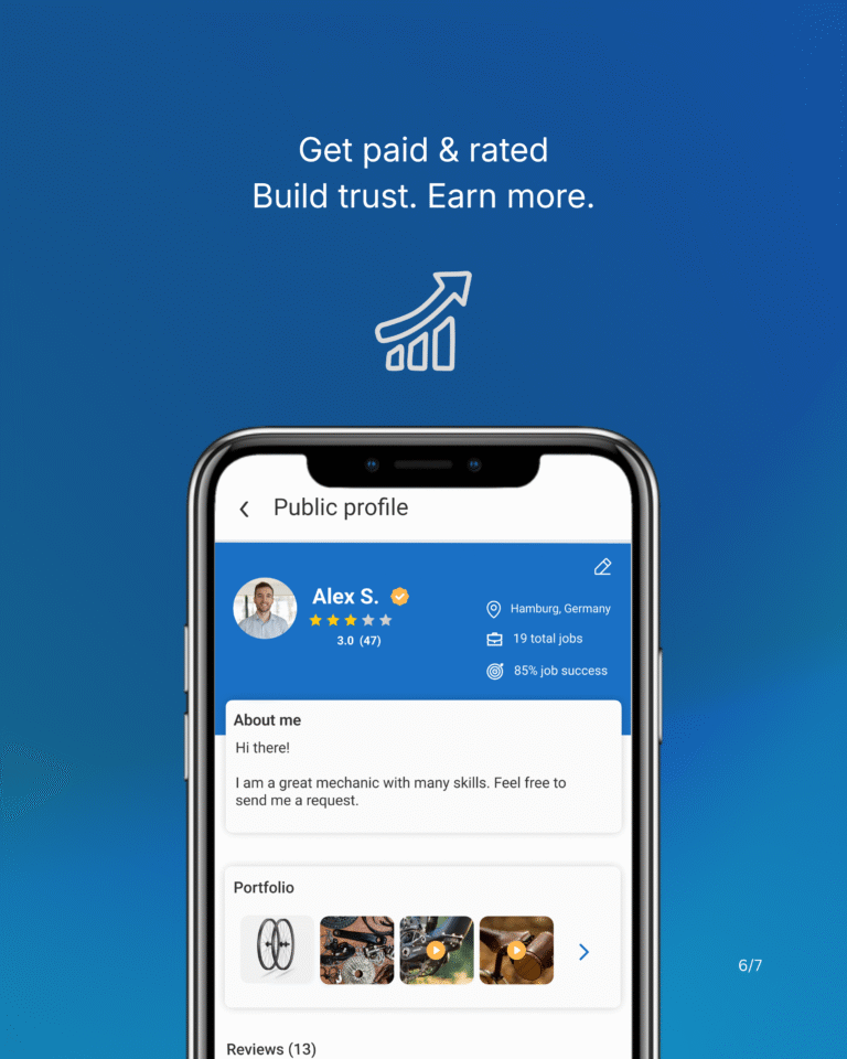 Registrieren Sie sich in der App als Mechaniker. Teilen Sie Ihr Fachwissen, listen Sie Ihre Dienstleistungen auf, legen Sie Ihre Preise fest und präsentieren Sie Ihre Erfahrung mit einem Profil, das die richtigen Kunden anzieht.