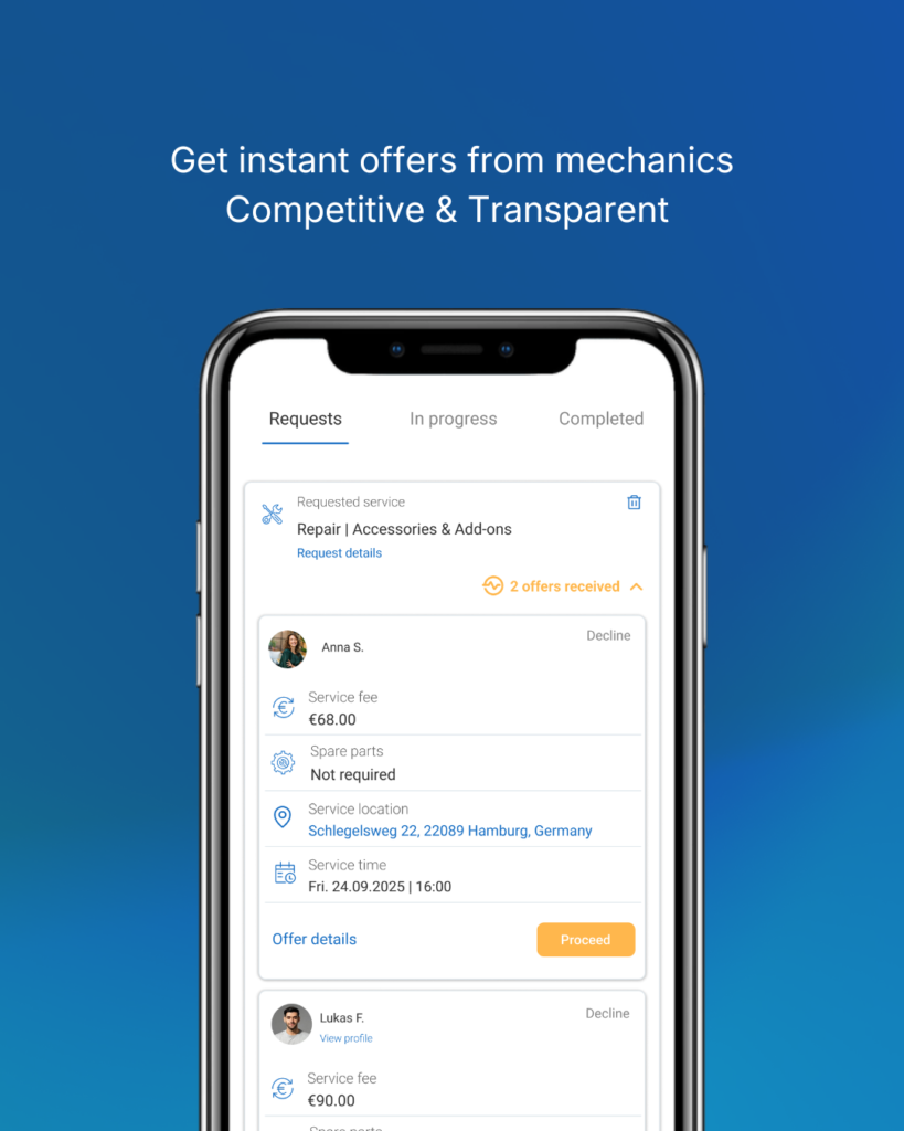 You can search for mechanics in your area using our app and view each mechanic’s profile, ratings, and service specialties. Once you find a mechanic you like, you can either send a direct request for a quote or, alternatively, post a general service request that multiple mechanics can review and respond to with their offers.