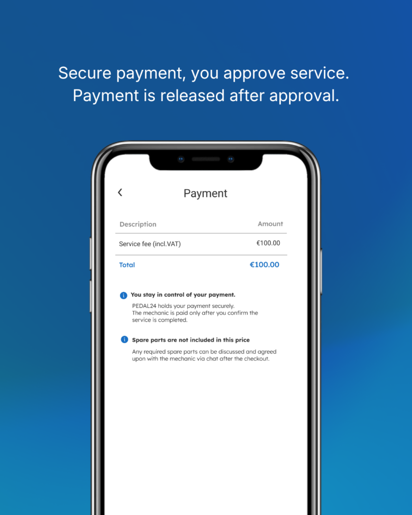 PEDAL24 manages payments directly through our platform. Once both you and the mechanic confirm the service, the payment remains pending until the service is completed. After you confirm that the service was satisfactorily completed, the payment is released to the mechanic’s account. Mechanics can withdraw their earnings monthly.
